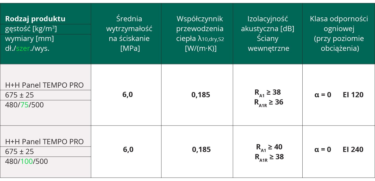 - H+H PANEL TEMPO PRO panel z betonu komórkowego o podwyższonej izolacyjności akustycznej do budowy ścian działowych wykończonych gładziami cienkowarstwowymi