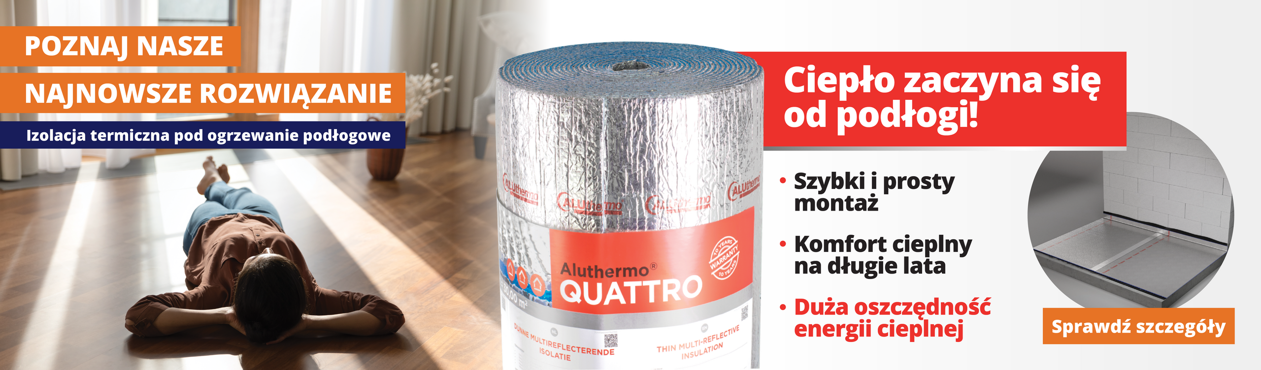 Izolacja Aluthermo® QUATTRO doskonale sprawdza się w ociepleniu nowych budynków. Z uwagi na swoją niewielką grubość 1 cm, jest niezastąpionym rozwiązaniem przy wszelkiego rodzaju adaptacjach, remontach czy renowacjach, gdzie bardzo dużym wyzwaniem jest ograniczona ilość miejsca na odpowiednią izolację. Dzięki temu, często wybierana jest do izolacji poddaszy, dachów czy ścian, ale również podłóg czy nadproży okiennych.